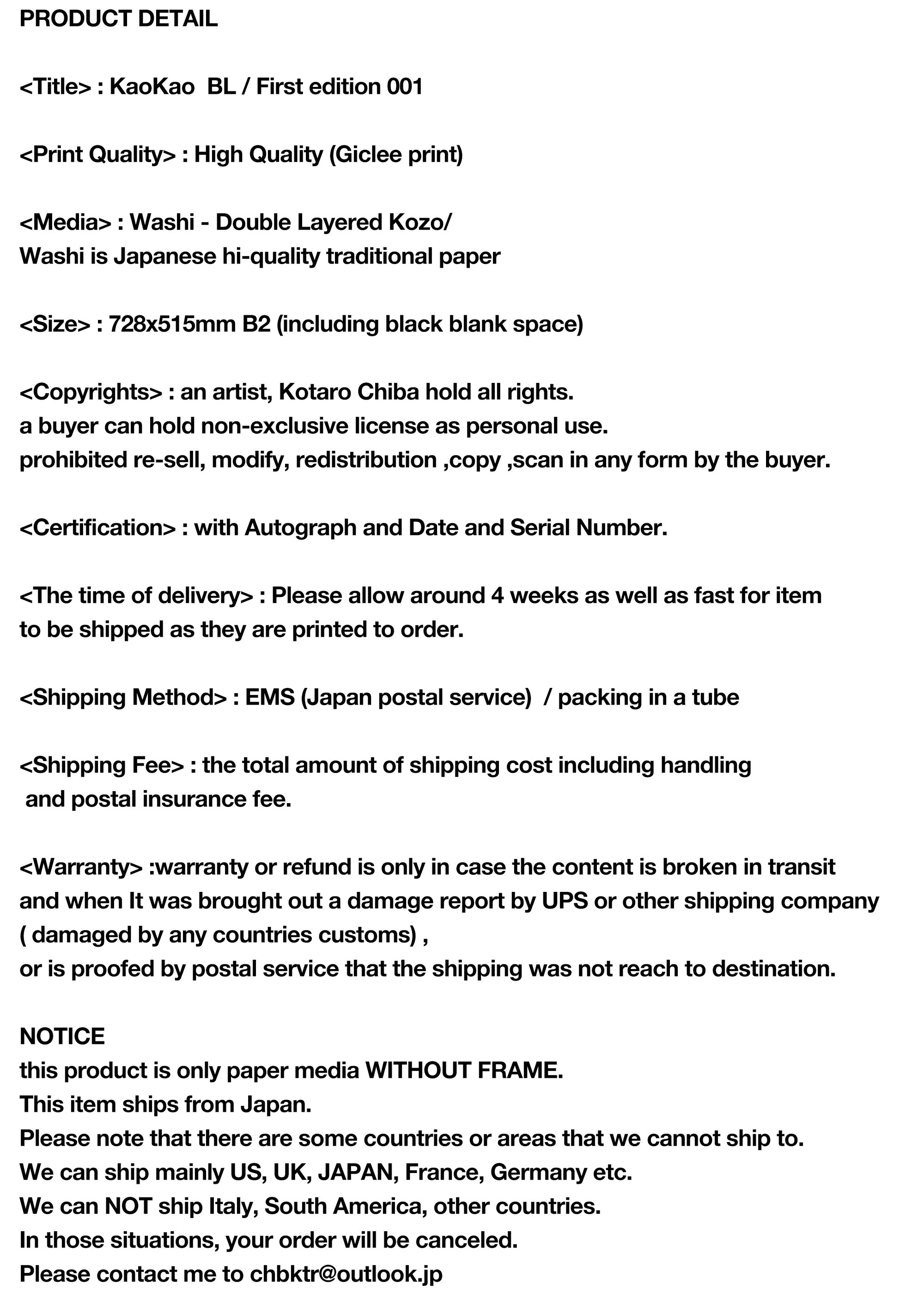 Shipping Method : EMS (Japan postal service) / packing in a tube